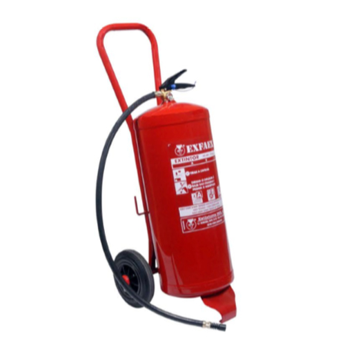 Fire extinguisher EXFAEX branded, with a 25kg ABC dry powder capacity. The extinguisher is mounted on a two wheeled metalic trolley for an easy transport. Suitable for use in in wide commercial and industrial areas.