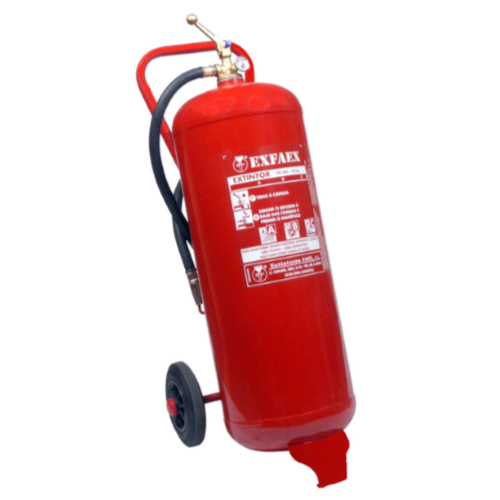 Fire extinguisher EXFAEX branded, with 50kg ABC drypowder capacity. The extinguisher is mounted on a two wheeled metalic trolley for an easy transport. Suitable for use in wide commercial and industrial areas.